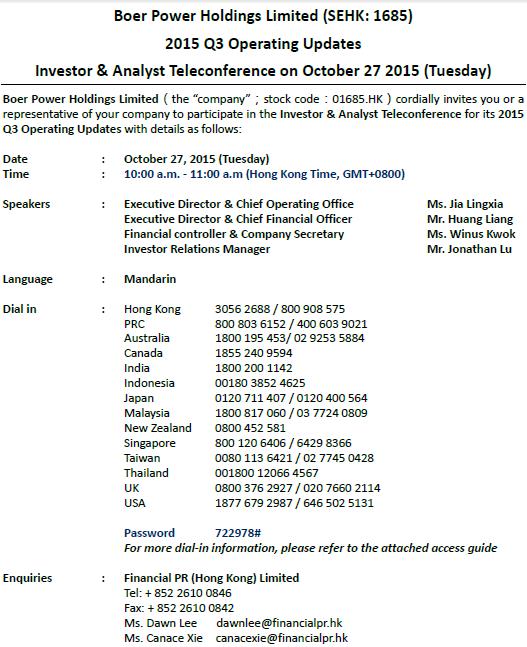三亿电子2015年前三季度营运数据投资者电话会议邀请函如下: