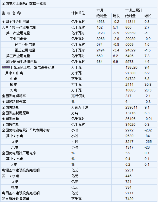 9月份,全社会用电量4563亿千瓦时,同比下降0.2%。
