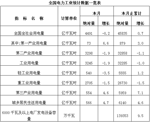 近日从国家能源局网站获悉,国家能源局今日发布了10月份全社会用电量,同比下降0.2%。