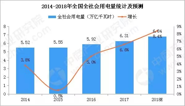 据初步统计数据显示,2018年全国日均发电量为184.68亿千瓦时,同比增长8.52%。其中,全社会用电量同比增速预计也将在8%以上,两者均有望创七年以来新高。