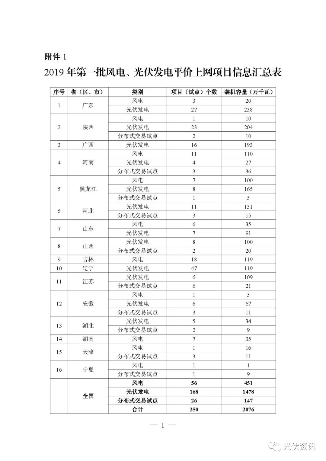 附件:1.2019年第一批风电、光伏发电平价上网项目信息汇总表